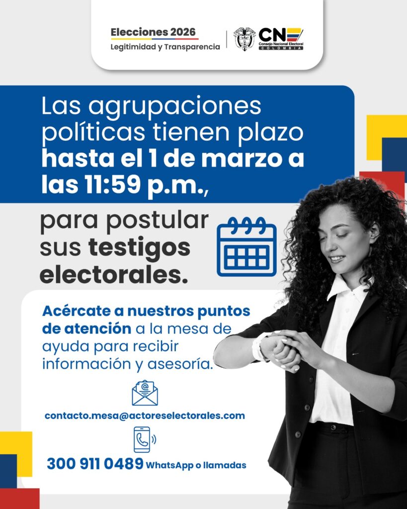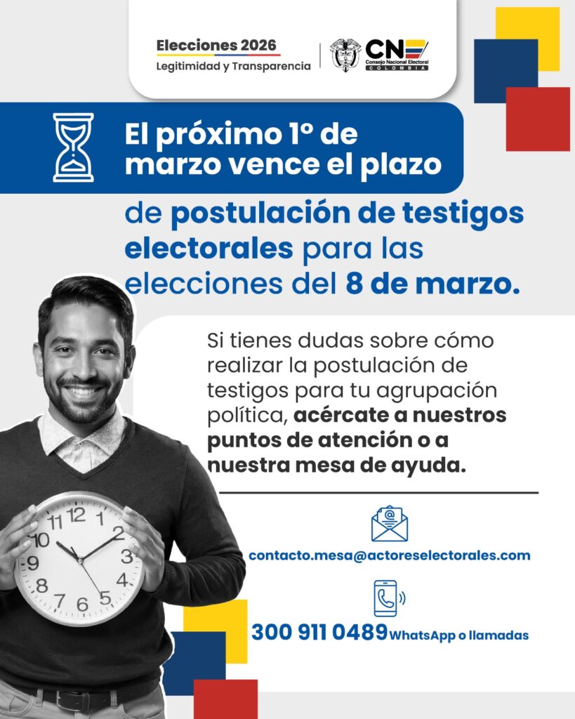 El Consejo Nacional Electoral – CNE hace un llamado a los partidos y movimientos políticos que participarán en las próximas elecciones legislativas a realizarse este 8 de marzo, para que inscriban a sus observadores y testigos electorales, pues la plataforma disponible para este proceso cierra este registro este domingo 1 de marzo a las 11:59 de la noche.
