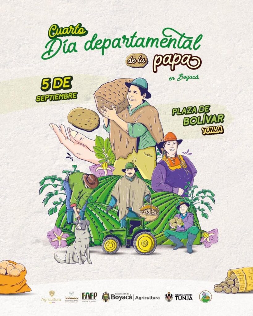 La Gobernación de Boyacá, en articulación con la Alcaldía de Tunja, el Ministerio de Agricultura y Desarrollo Rural, Fedepapa, el ICA, Agrosavia, la ANDI y el Banco Agrario, invita a toda la comunidad a participar en la cuarta edición del Día Departamental de la Papa, que se llevará a cabo el próximo viernes 5 de septiembre en la Plaza de Bolívar de Tunja, con una agenda académica, cultural y comercial en homenaje a los productores paperos.