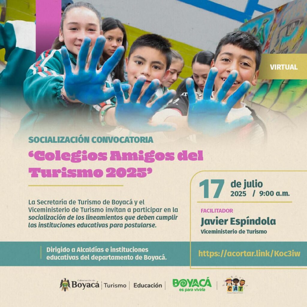 Este espacio, que se realizará el próximo jueves 17 de julio, a las 9:00 a. m., en la modalidad virtual, mediante la plataforma Microsoft Teams, permitirá a las comunidades educativas conocer en detalle cómo vincularse al programa y contribuir al fortalecimiento del turismo desde la academia y el desarrollo local.
