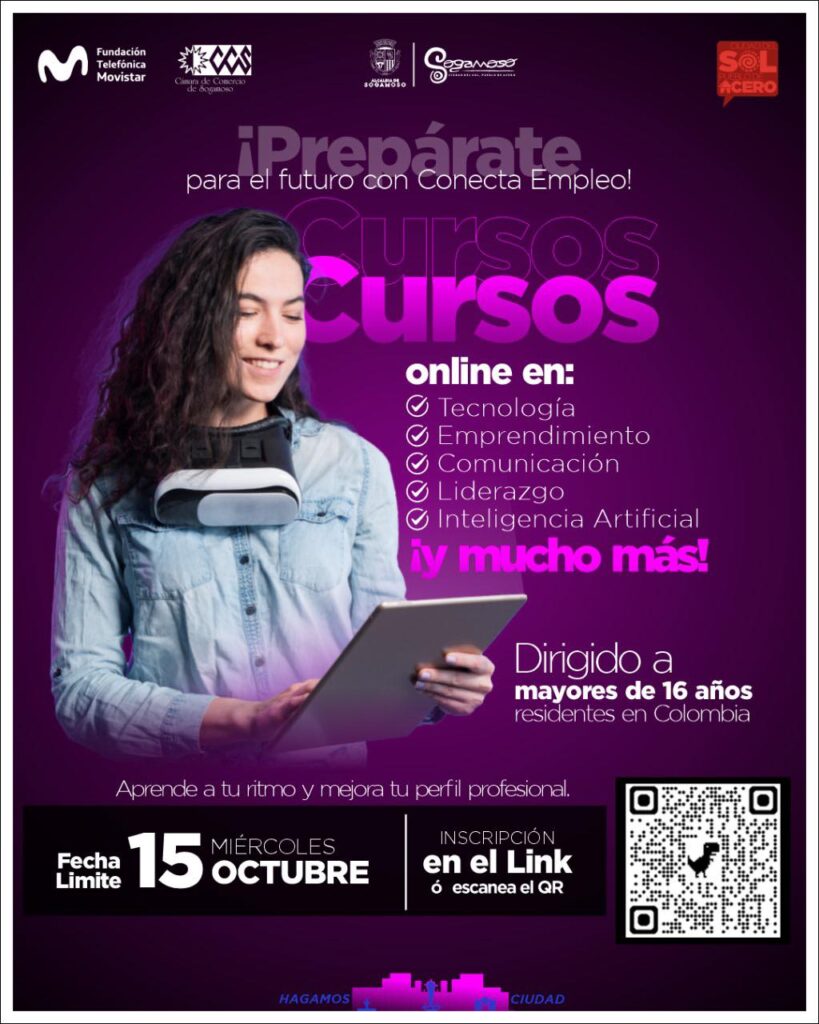 La Administración Municipal de Sogamoso, a través de la Secretaría de Tecnología e Innovación, en articulación con la Fundación Telefónica Movistar y la Cámara de Comercio, invita a la ciudadanía a participar en los cursos gratuitos de formación en habilidades digitales profesionales ofrecidos por el programa Conecta Empleo