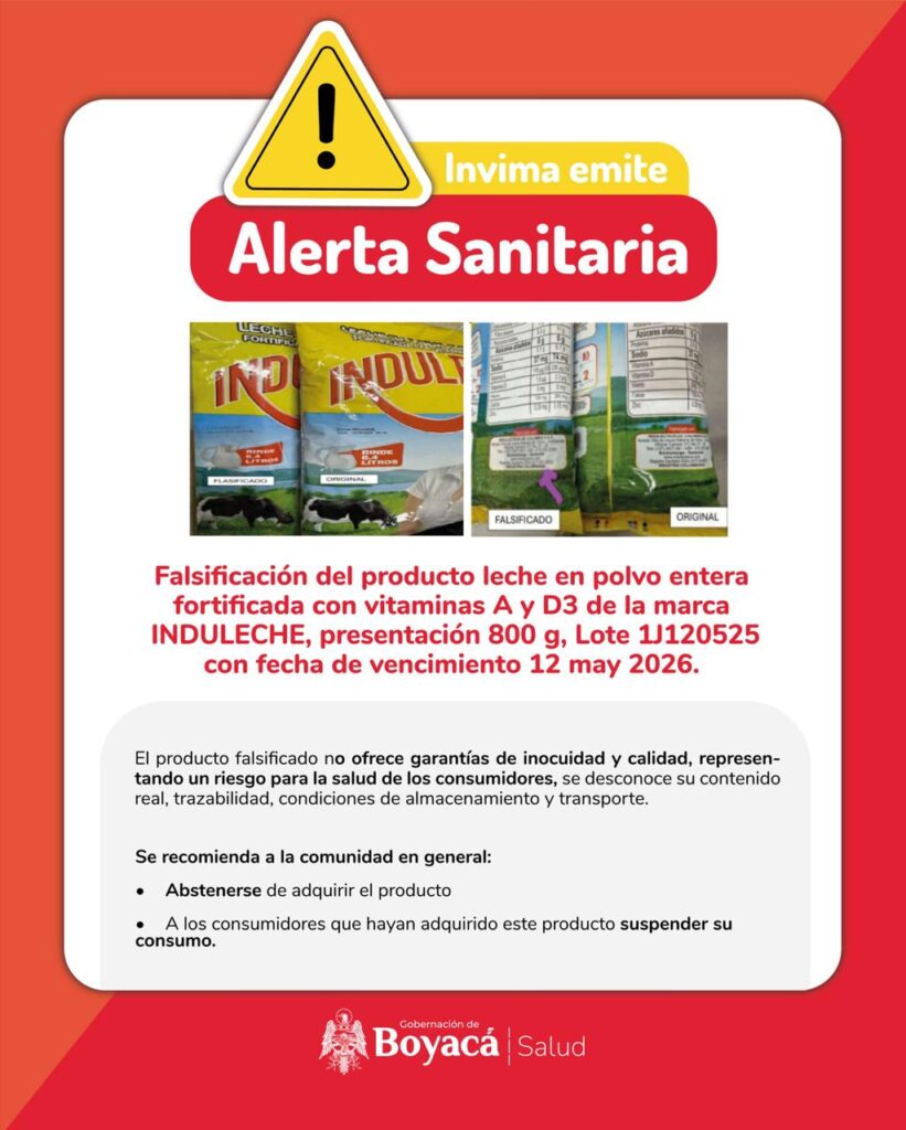 La Secretaría de Salud de Boyacá informa a la comunidad en general que el Instituto Nacional de Vigilancia de Medicamentos y Alimentos (Invima) emitió una alerta sanitaria por la falsificación del producto ‘leche en polvo entera fortificada con vitaminas A y D3’ de la marca INDULECHE, presentación 800 g, lote 1J120525, con fecha de vencimiento 12 de mayo de 2026.