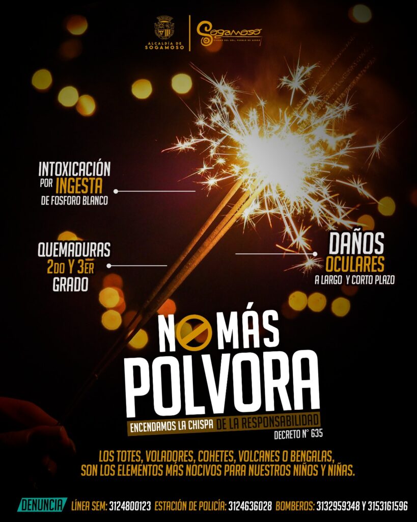 Durante la temporada festiva de fin de año, el Municipio de Sogamoso ha emprendido diversas acciones encaminadas a proteger a la ciudadanía, especialmente a los menores de edad, frente a las consecuencias de la manipulación inadecuada de elementos pirotécnicos. En este sentido, se expidió el Decreto 635 de 2025, mediante el cual se reglamenta la manipulación, transporte, almacenamiento, comercialización, compra, venta y uso de pólvora, productos pirotécnicos y fuegos artificiales.