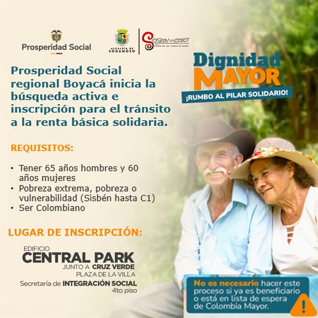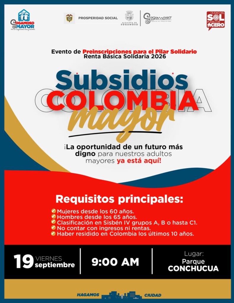 Este viernes 19 de septiembre, a partir de las 9:00 de la mañana en el Parque Conchucua, Prosperidad Social Regional Boyacá, en cabeza del Dr. Héctor Osbaldo Ávila Rodríguez, junto con la Alcaldía de Sogamoso, liderada por el alcalde Dr. Mauricio Barón Granados, y la Secretaría de Integración Social, dirigida por Diego Fernando Fuquen Fonseca, realizará una jornada de búsqueda activa y preinscripción para el programa Renta Básica Solidaria 2026.