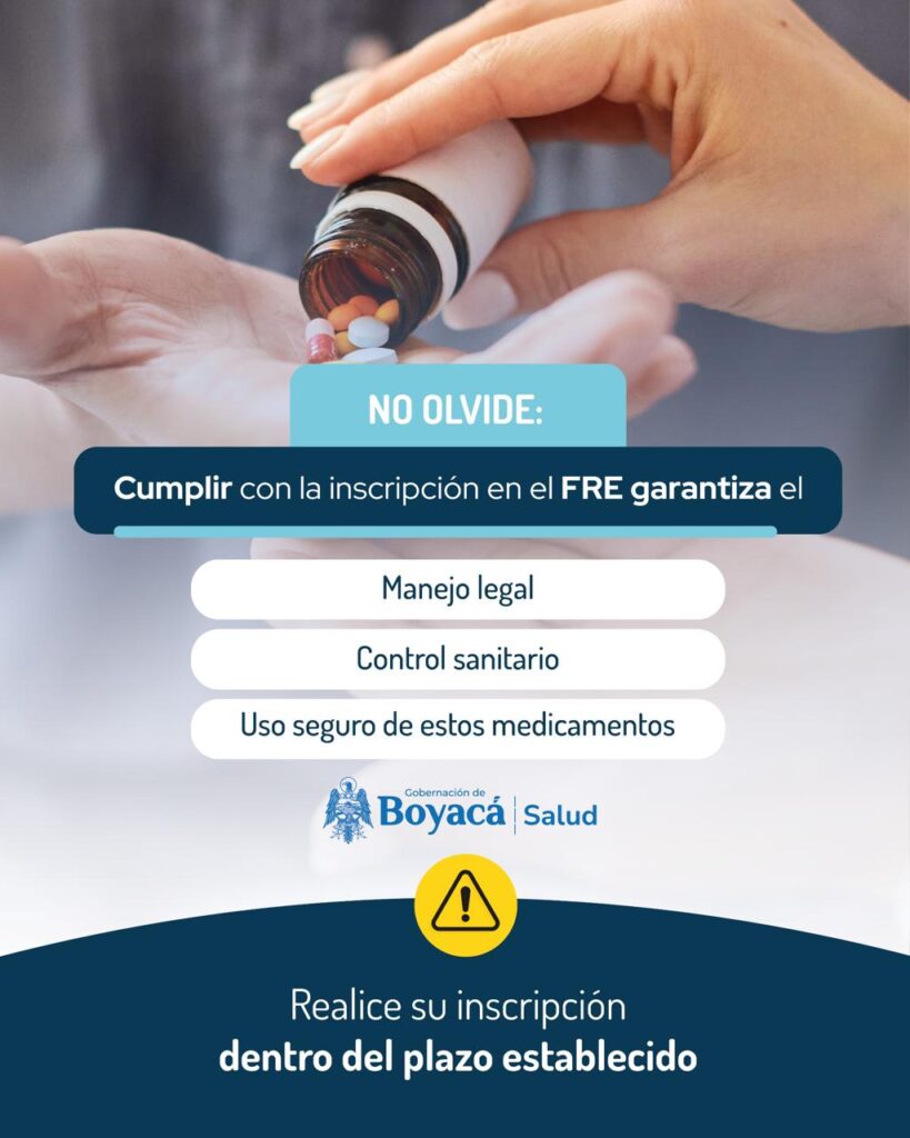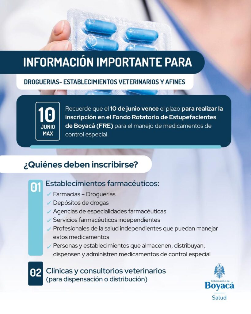 La Secretaría de Salud de Boyacá, a través del Fondo Rotatorio de Estupefacientes (FRE), informa a las entidades públicas y privadas del sector salud, establecimientos farmacéuticos, servicios farmacéuticos, médicos veterinarios, clínicas y consultorios veterinarios, así como a las demás organizaciones que manejan medicamentos de control especial, que es obligatoria su inscripción ante esta instancia para la distribución, dispensación y uso de dichos medicamentos.